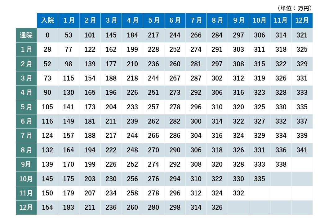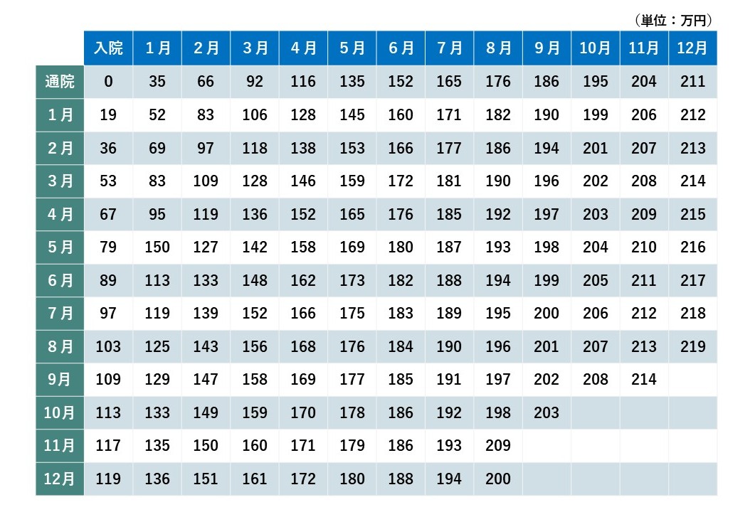 <【傷害慰謝料】裁判所基準(赤い本) 別表Ⅰ>